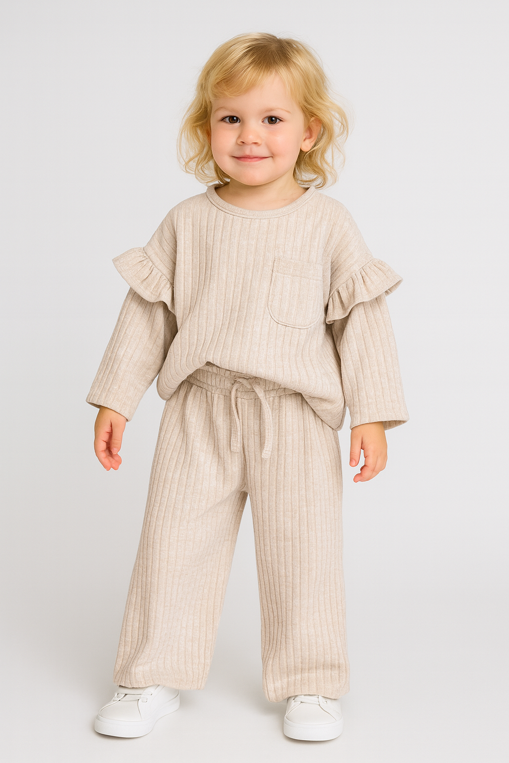 Kız Çocuk Fitilli Geniş Paça Alt-Üst Takım Krem